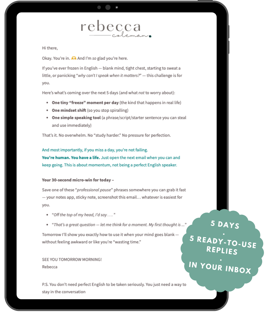 Learn the calm, natural replies that keep you in the conversation, even if your English isnât âperfect.â One tiny mindset shift and one ready-to-use reply each day. Delivered straight to your inbox.Â